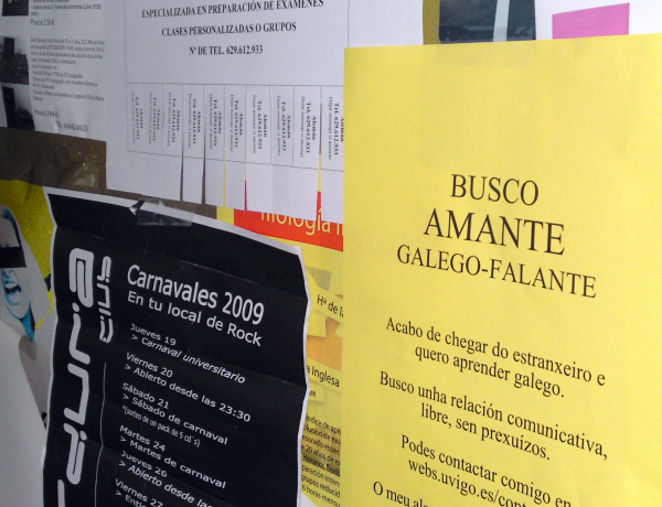 Os anuncios que estes días se están a ver polas facultades da Universidade de Vigo deixan ás claras que ter un amor (ou sexo esporádico, iso cada quen) é tarefa ardua; se ademais se quere en galego, mellor ficar a ler o blog da 'erotómana' Susana Moo.