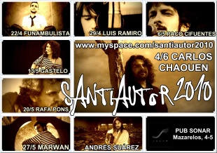 Será na compostelá sala Sonar, en Mazarelos, todos os xoves desde o 22 de abril e ás 22h30. Con só 5 euros como prezo da entrada, o público terá oportunidade de vivir as propostas que o Santiautor deseñou para as vindeiras semanas. O encargado de abrir o ciclo será o murciano Funambulista este mesmo xoves. Como mestre de cerimonias actuará tamén todas as semanas o cantautor ferrolán Andrés Suárez.